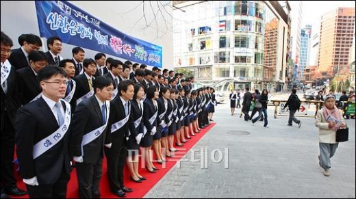 신한은행 직원들이 통합 3주년 기념을 기념해 1일 오전 서울 명동입구에서 '신한은행과 함께 행복가득 희망을 키우세요' 퍼포먼스를 펼치고 있다.