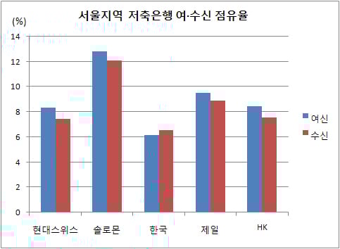 또한 올 1~3월 서울지역 저축은행들의 수신점유율을 보면 여신부문과 마찬가지로 현대스위스와 제일저축은행의 점유율은 늘고 나머지 대형사들은 감소한 것으로 나타났다.