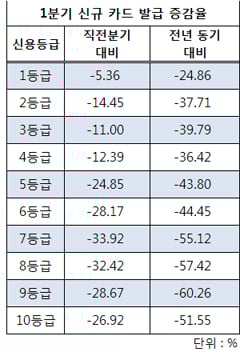 ◇카드사 발급심사 강화=15일 한국신용정보(한신정)에 따르면 올 1분기 동안 신규 발급된 신용카드는 모두 216만6097장으로 전년동기 대비 38.97% 감소했다. 이는 직전분기인 지난해 4분기와 비교했을 때도 15.04% 줄어든 수치다.
