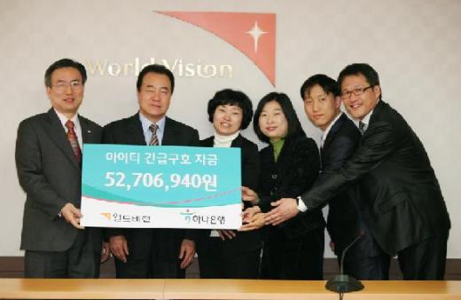 하나은행은 이날 서울 여의도 월드비전 사무실에서 임영호 하나은행 인재개발본부 부행장보, 유일남 월드비전 본부장, 한인수 친선대사 등이 참석한 가운데 5270만6940원의 기부금을 전달했다. 기부금은 월드비전을 통해 아이티의 긴급구호·재건 자금으로 사용된다.