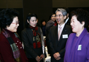 신창재 회장(사진 오른쪽부터 두번째)을 비롯한 교보생명 임원 26명은 이날 신라호텔 다이너스티홀에서 열린 우수고객 초청 신년행사에 참석해 100여명의 고객을 직접 맞이했다. 설을 앞두고 그 동안 ‘라포 프로그램’을 통해 만났던 고객들을 다시 초청해 감사의 인사를 전하기 위한 것이다.