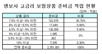 준비금은 생명보험사가 계약자들에게 지고 있는 부채의 합을 말하는데 고금리 상품 중에서도 금리 7.5~8.0% 상품의 준비금이 72조2876억 원(30.7%)으로 가장 많았다. 8.5~9.0% 상품 준비금도 13조6508억원(5.8%)이나 됐다. 10% 이상 상품의 준비금도 7935억 원(0.3%)이었다.