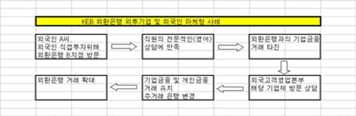 '외국인 A씨는 외국인직접투자 신고 차 외환은행 B지점을 방문했다. 직원의 유창한 영어로 진행된 상담에 만족한 A씨는 외국계투자기업의 재무최고책임자(CFO)인 부인에게 B지점을 소개시켜줬다. A씨의 부인은 기업의 주거래 은행을 외환은행으로 바꿨다. 외환은행은 A씨 부부의 개인금융 뿐 아니라 기업금융 주거래 은행이 됐다.'