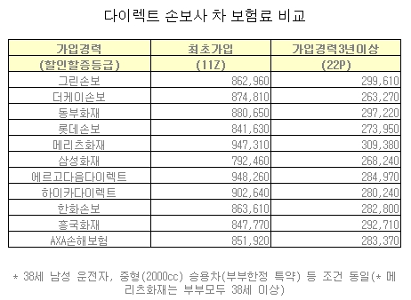 동부화재는 100만2000원과 88만원(다이렉트)으로 판매 채널에 따라 보험료 차이가 12만원에 달했다. 현대해상의 다이렉트보험 자회사인 하이카다이렉트는 90만2000원이었다.