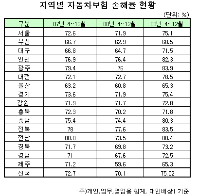 지역별로 보면 울산 제주(65.3%) 부산(68.5%) 등의 지역은 손해율이 70%에 못 미쳤다. 울산과 제주는 각각 2007년과 2008년 같은 기간에도 이 비율이 전국에서 가장 낮았다.