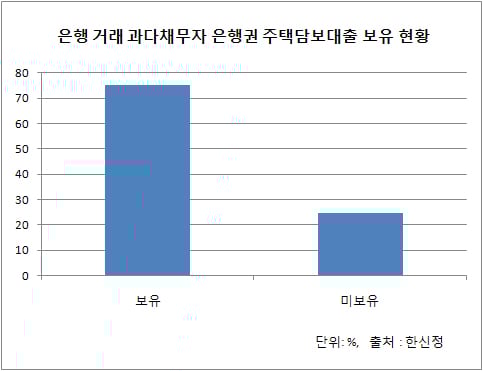 1일 개인신용평가회사(CB)인 한국신용정보에 따르면, 작년말 현재 은행에서 돈을 빌린 과다채무자 중 75.22%가 은행 주택담보대출 이용자인 것으로 집계됐다. 전체 과다채무자의 76.57%가 은행에서 대출을 받았다는 점을 고려할 때 과다채무자의 거의 대다수가 은행에서 주택담보대출을 받은 셈이다.