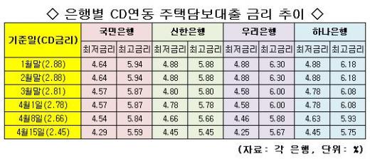 실제 은행별 CD연동 대출 금리는 큰 폭으로 하락했다. 은행별로 대출금리가 0.17∼0.63%포인트 떨어졌다. 국민은행은 지난 1월 4.46∼5.94%에서 지난 14일 현재 4.29∼5.59%로 0.17∼0.35%포인트 하락했다. 신한은행도 4.88∼5.88%에서 4.45∼5.45%로 0.43%포인트 감소했다. 우리은행은 0.63%포인트, 하나은행은 0.43%포인트 떨어졌다. 각 은행에서 CD연동으로 주택담보대출을 받은 고객들의 부담은 확실히 줄어들 전망이다.