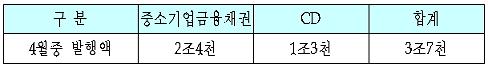 올 들어 발행한 2조2000억 원 규모의 CD 중 절반이 넘는 1조1900억 원어치가 2주 새 발행됐다. 이에 따라 금리는 갈수록 낮아졌다. 지난 3월만 해도 2.7∼2.8%선이었던 발행금리가 2.3%대로 큰 폭으로 하락했다. 이후 CD금리는 하루만에 2.72%에서 2.63%로 1%포인트 가까이 떨어지는 등 급락세를 보였다.