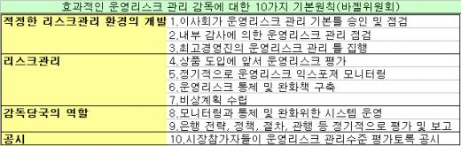 이에 따라 평상시 떠오르지 않고 잠재돼 있는 운영리스크가 금융회사에 미치는 영향을 선제적으로 인식하고 대처해야 한다는 주장이 대두되고 있다. 바젤위원회는 금융기관의 효과적인 운영리스크 관리와 감독 방안으로 △리스크 관리 환경 정비 △감독기관의 역할 △운영리스크 관리 상황 공시 등 10가지를 제시했다.
