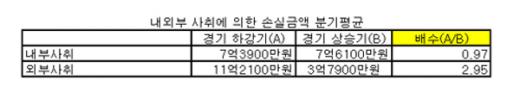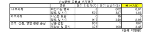 이 두 건을 제외하더라도 경기가 안 좋을 때 발생한 외부사취에 의한 손실금액은 11억 원으로 경기 상승기(4억 원) 대비 3배나 증가했다. 이 가운데 절도, 사기로 인한 피해 금액은 9억 원으로 상승기보다 2배 이상 늘었다.