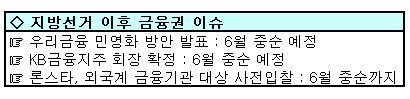 ◇KB금융 회장에 정부 입김 들어갈까=이달 중순에 확정 될 KB금융지주 회장 인사도 안개 속에 빠졌다. 정부가 지방선거 이후 보은 차원으로 KB금융 회장 자리에 관 출신 인사를 앉히려 한다는 소문이 선거 이전부터 끊이질 않았다.