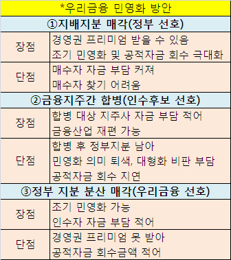 정부가 염두에 두고 있는 매각 방식은 크게 세 가지다. 지배 지분과 경영권을 통으로 매각하는 방안이 우선 꼽힌다. 다른 금융지주회사와 합병하는 방안과 지분을 잘게 쪼개 파는 방식도 거론된다. 국민연금 등 연기금이 일정 지분을 분산 보유하는 하는 것도 하나의 방법이다.
