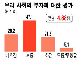 부자에 대해 비호감(1~4점)을 보인 비율은 26.1%로 호감(6~10점)도를 나타낸 비율(21.6%)에 비해 높게 나타났다. 하지만 이 격차는 지난해에 비해 9.5% 포인트나 줄었다.