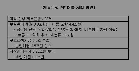 방안에 따르면 정부는 사실상 공적자금인 구조조정기금으로 저축은행의 부실우려 PF 대출을 인수키로 했다. 총 3조8000억원 규모다.