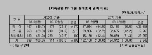 금융당국이 지난해말 기준으로 저축은행의 전체 PF 대출 12조5000억원(714개 사업장)에 대한 실태 조사 결과를 보면 '악화 우려' 채권이 3조9000억원. 지난 2008년 6월 조사에 비해 2조4000억원이 늘었다. 보통이었다가 부실 악화로 재분류된 1조원을 포함하면 부실채권 규모는 5조원에 달한다.