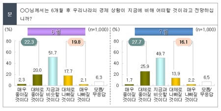 다만 이 질문에도 지난달보다는 긍정적인 답변이 늘어 경기회복에 대한 기대도 조금씩이나마 커지고 있음을 보여줬다. 지금보다 나아질 것이라고 보는 국민 비율은 1개월 전보다 5.4%포인트 늘었고, 부정적 의견은 한 달 동안 3.7%포인트 줄었다.