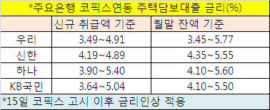 대출 고객들의 근심이 깊어지고 있다. 당장 이번 주부터 금융회사들의 대출금리가 일제히 인상된다. 기존 대출자들은 물론 신규 대출 고객들이 내야 할 이자도 늘게 됐다. 이미 대출을 받아 집을 산 고객들은 이자부담에다 집값하락이란 '이중고'에 처할 전망이다.