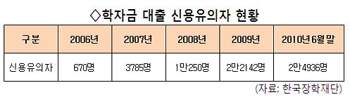 2006년 670명이었던 신용유의자는 2007년 3785명, 2008년 1만250명, 2009년 2만2142명으로 해마다 크게 늘고 있다. 학자금 대출을 받은 학생이 이자를 1개월만 연체해도 신용유의자가 된다. 만일 6개월 동안 이자를 내지 못하거나 원리금을 상환하지 못하면 은행연합회에서 관리하는 은행권 개인 신용정보에 '신용불량자'로 등록된다.