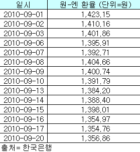일본 정부가 외환시장에 개입한지도 이제 닷새가 지났다. 지난 8월부터 고공행진을 거듭하며 1400원대를 웃돌았던 원/엔 환율은 일본 정부의 시장 개입 후 하락세로 돌아서 20일 현재 1356.86원을 기록했다.