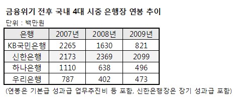 실제로 KB국민은행은 당시 강정원 전 행장의 연봉을 2007년 22억6500만 원에서 지난해 8억2100만 원으로 63% 삭감했다. 하나은행장과 우리은행장 연봉도 2007년 각각 11억1000만 원과 8억8700만원에서 지난해 4억원 대로 절반 가까이 줄었다.