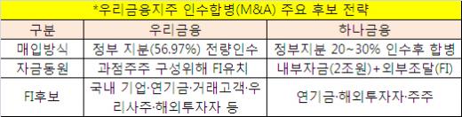 경영권 프리미엄을 얹어 정부 지분을 다 산다고 가정하면 단순 계산으로도 인수자는 8조원에 달하는 자금이 필요하다. 따라서 우리금융 M&A의 승부처는 '자금력'이다. 정부 지분을 우호적 '과점주주'가 오롯이 인수하길 원하는 우리금융과 지분 일부를 산 후 '합병'을 바라는 하나금융이 FI 유치에 총력을 기울이는 이유가 여기에 있다.