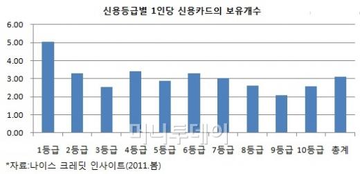 나이스신용평가정보에 따르면 지난해말 1인당 신용카드의 보유개수는 1등급이 5.06매로 가장 많았다. 이어 4등급(3.40매), 2·6등급(3.31매) 순으로 평균(3.11매)을 웃돌았다.