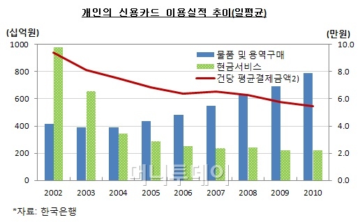 평균결제금액은 소액화되는 추세다. 천원 단위의 작은 액수도 카드로 결제하는 사람이 많아졌다. 실제로 평균결제금액은 2002년 9.4만원에서 2006년 6.4만원, 2009년 5.8만원, 2010년 5.5만원 등으로 점차 낮아지고 있다.
