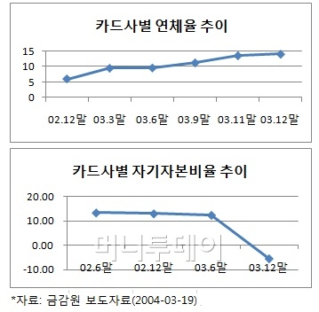 금융감독원이 올해 2월에 발표한 자료에 따르면 전업 카드사의 연체율은 2003년 28.3%에서 지난해 1.7%로 현저히 낮아졌다. 조정자기자본비율도 2003년 자본잠식(-3.3%)에서 지난해 28.5%로 우량해졌다.