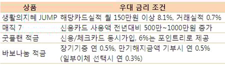 # 연이율 10% 이상의 적금이 나왔다는 소식에 은행을 찾은 이지연씨(28)는 실망감에 발길을 돌렸다. 매달 신용카드 사용실적이 150만원이 넘어야 최대 이율을 받을 수 있고 적금 만기이율은 연 3%대에 불과했기 때문. 이씨는 "우대 금리로 받는 이자보다 지출이 커 오히려 손해"라며 "은행직원도 기본이율이 높은 연 4.5%의 다른 상품을 추천해줬다"고 말했다.