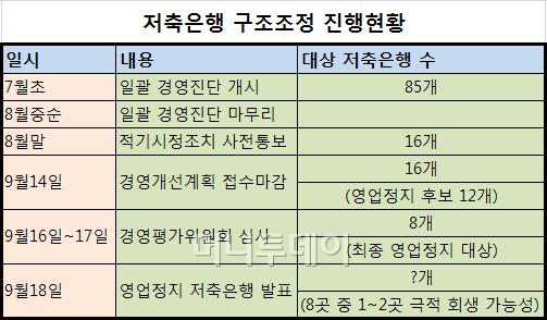 ◇85개→16개→12개 = 금융당국이 일괄 경영진단에 돌입한 지난 7월부터 85개 저축은행의 희비는 시시각각 엇갈렸다. 지난 달 말 구조조정 돌입의 신호탄을 알리는 경영진단 결과가 사전 통보됐다. 85개 중 16개 저축은행이 구조조정이 필요한 적기시정조치(부실 혹은 부실징후) 대상으로 분류됐다.