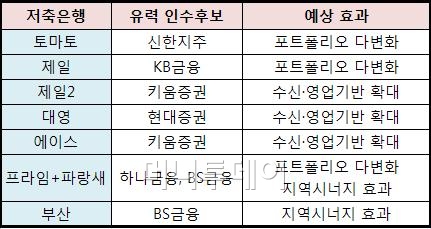 프라임+파랑새저축은행(7058억원)은 하나금융과 BS금융의 경합이 예상된다. 하나금융은 현재 외환은행 인수가 더 시급한 상태지만 서울에 본점과 지점을 갖고 있는 프라임저축은행 인수에 적극적인 것으로 전해졌다. BS금융은 부산이 주요 영업 지역인 파랑새 저축은행 등을 통해 인수 시너지를 기대하고 있다.