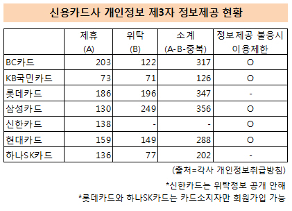 이 밖에 BC카드 317곳, 하나SK카드 202곳, KB국민카드 126곳으로 집계됐다. 신한카드의 경우 위탁 목적으로 제공하는 개인정보 현황을 홈페이지에서 공개하지 않고 있다. 개인정보보호법에 따르면 "위탁하는 업무의 내용과 개인정보 처리 업무를 위탁받아 처리하는 자를 정보주체가 언제든지 쉽게 확인할 수 있도록 공개해야 한다"고 규정돼 있다.