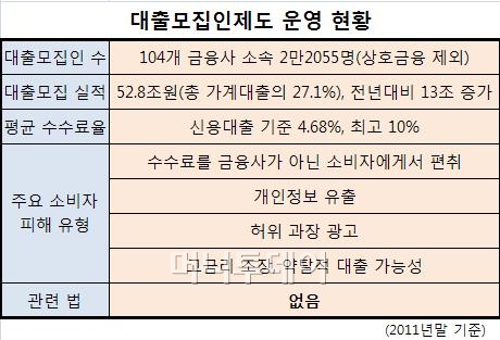 법망의 허점 속에 모집인들의 영업은 활개를 치고 있다. 지난 2011년 말 기준 은행연합회 등 각 금융협회에 공식 등록된 대출모집인의 숫자는 104개 금융사에 총 2만2055명(상호금융 제외)이다.