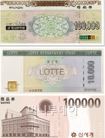 12일 금융권에 따르면 현대, 롯데, 신세계 등 국내 주요 백화점에서는 현재 상품권 구매수단으로 현금, 법인카드만 허용하고 있다. 현금의 경우 별도의 제한 없이 구매할 수 있지만, 법인카드는 한도의 범위 내에서만 결제할 수 있다. 법인카드로 결제시 신분증과 사업자등록증사본 등의 서류도 필요하다.