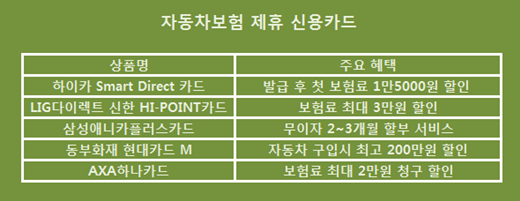 삼성화재와 삼성카드가 제휴를 맺은 삼성애니카플러스카드는 자동차보험료 결제 시 최대 3만원 할인과, 2~3개월 무이자 할부 서비스를 제공한다. 동부화재 현대카드 M도 보험료 결제 시 최대 3만원이 할인된다. 또 자동차 구입 시 최고 200만원까지 할인 받을 수 있다. AXA하나카드는 결제 시 2만원 청구할인되고, 무이자 2~3개월 할부도 가능하다.