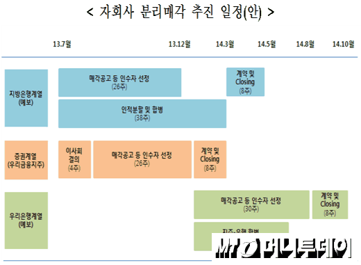 매각은 지방은행 계열과 증권 계열 매각을 동시에 추진하고 은행 계열은 내년 1월 시작된다. 다만 지방은행 계열이 다음달 15일 매각공고와 함께 시작되는 반면 증권 계열은 우리금융 이사회 결의 및 매각자문사 선정 기간 등을 고려해 8월에 매각공고를 낼 예정이다.