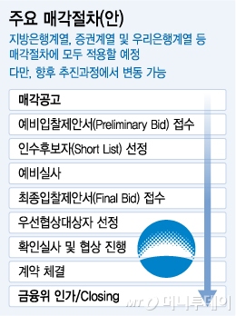 매각절차 역시 신속하게 추진할 방침이다. 신 위원장은 "지방은행계열과 증권계열은 이번 방안을 발표한 직후인 7월부터 동시에 매각을 추진하고 우리은행계열은 내년 초에 매각을 시작해 내년 안에 모든 절차가 완료될 수 있도록 할 것"이라고 말했다.