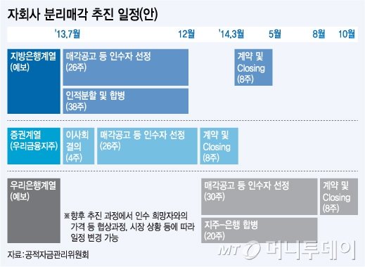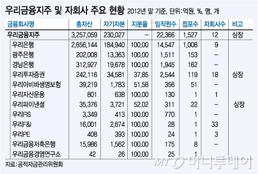 우리은행은 지방은행과 증권 계열에 이어 마지막으로 판다. 증권계열 중 팔리지 않은 곳들과 우리카드, 우리PE, 우리FIS, 금호종금, 우리금융경영연구소 등이 우리은행의 자회사로 함께 매각된다.