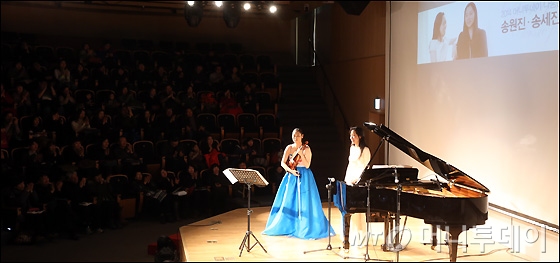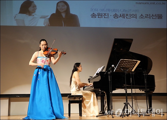 송원진-송세진 자매가 19일 오후 서울 KT 광화문지사 1층 올레스퀘어 드림홀에서 열린 머니투데이와 함께하는 '송원진·송세진의 소리선물 콘서트'에서 아름다운 클래식 선율을 연주하고 있다. 송세진이 피아노 연주로 드뷔시의 '달빛'과 베토벤의 '월광'을, 송원진이 바흐 바이올린 소나타 6번을 관객들에게 선사했다. 소리선물 콘서트는 접하기 힘든 클래식 공연의 티켓 가격을 5000원으로 책정하고, 입장료 수익금 전액을 어려운 가정의 청각장애 어린이 보청기 지원 등을 위해 기부한다. 독자들의 PICK! 홍서범 전 며느리 "아들 외도, 대중에 사과? 저에게 하시라" 분노 월 700만원 벌어도..."생활비 30만원, 한국인 남편 짠돌이" 화사, 속옷이 다 보여...과감한 드레스 연출에 '깜짝' 이하이 "도끼, 하나뿐인 내 남자" 열애 인정…"두 사람 지금 미국에"