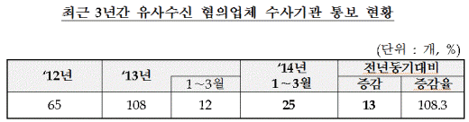 금감원은 앞서 지난 1월~3월 사이 이같은 유사수신 혐의업체 25개사를 적발해 수사기관에 통보한 바 있다. 이는 전년동기(12개사) 대비 13개사(108.3%)가 증가한 것으로 주식투자, 부동산 투자, 외환투자, 해외투자 등 고수익을 미끼로 한 불법 유사수신 행위가 성행하고 있다고 밝혔다.
