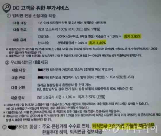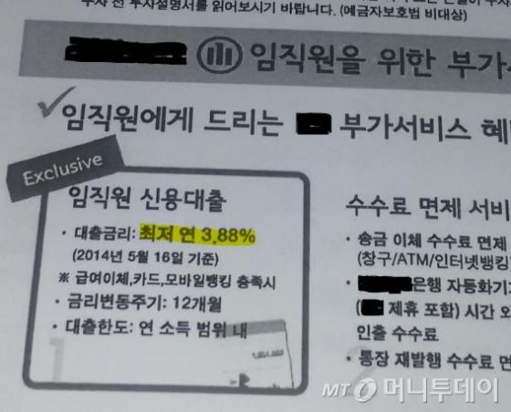 K은행도 자사 퇴직연금 소개자료를 통해 '임직원에게 드리는 부가서비스 혜택'이라는 항목에서 'Exclusive 임직원 신용대출 최저 연 3.88%'를 제시했다. 이 은행 콜센터를 통해 신용대출 금리를 확인한 결과 5.5%~8%를 제시했고 급여이체와 신용카드 개설, 영업점장 우대금리를 포함해도 최저 4.6%였다. 은행연합회에 공시된 일반신용대출 최저금리는 1~3등급 기준 금리는 4.14%였다. 이 은행 대출 상담직원은 "신용대출이 최저 3.88%라면 공무원이나 전문직 등 특수한 경우에만 제시하는 금리로 일반 직장인은 해당되지 않는다고 보면 된다"고 잘라 말했다.