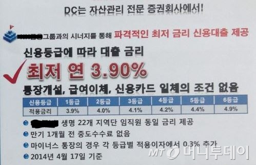 증권계 퇴직연금 사업자들도 이에 대응해 일부 중소형 은행과 연계된 신용대출 서비스를 제공하지만 금리는 최저 4%대 중후반이다. 다만 은행 지주계열인 W증권의 경우 최저 연 3.9%에서 최대 4.9%의 공격적인 금리를 제시했다. 이 회사는 특히 통장 개설이나 급여 이체, 신용카드 개설 등 일체 조건도 없다.