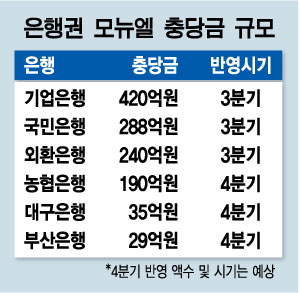 우선 기업은행은 모뉴엘 관련 충당금을 420억원 규모로 책정했으며, 오는 31일 예정된 실적발표에 이를 반영할 계획이다. 또 지난 26일 3분기 실적을 발표한 국민은행과 외환은행은 각각 288억원과 240억원의 충당금을 쌓았다.