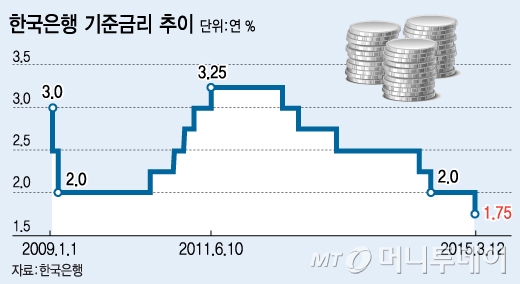 한국은행 금융통화위원회는 12일 국내 기준금리를 2.00%에서 1.75%로 0.25%p 내렸다. 지난해 10월 2.25%에서 2.00%로 내린 뒤 5개월 만이다.