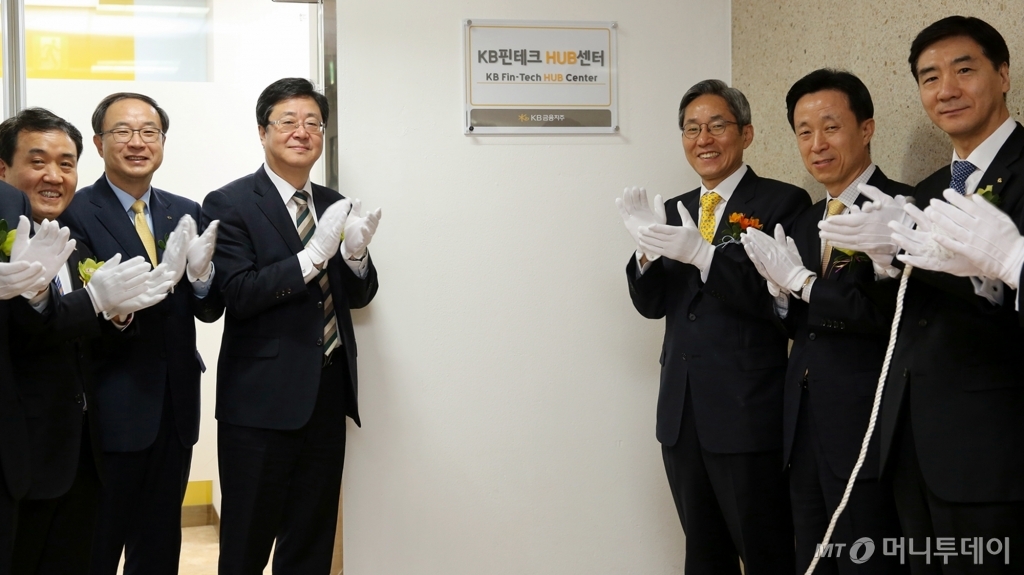 KB금융그룹이 26일 KB국민은행 명동본점에서 윤종규 회장과 주요 계열사 임원들이 참석한 가운데 KB핀테크 허브센터 출범식을 열고 핀테크 스타트업(신생벤처)의 지원과 제휴협약 추진 등의 공식업무에 돌입한다고 밝혔다.