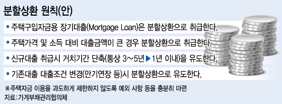 특히 은행들마다 주택담보대출은 원칙적으로 분할상환대출로 취급하는 시스템을 구축하도록 했다. 금융당국은 은행 스스로 가이드라인을 만들라고 했지만 친절하게 예시까지 들었다. △주택구입자금융 장기대출은 분할상환대출로 취급, △주택가격 및 소득대비 대출금액이 큰 경우 분할상환대출로 취급, △통상 3~5년인 거치기간은 1년 이내로 단축 유도, △기존대출 만기연장시 분할상환 유도 등이다.