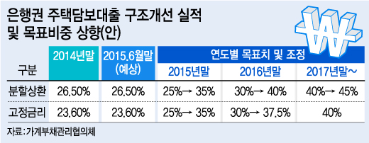 분할상환대출을 확대하기 위해 은행권의 연도별 분할상환대출 목표비율은 상향 조정된다. 올해 말 총 주택담보대출 중 분할상환대출 비율 목표는 25%에서 35%로, 2016년은 30%→40%, 2017년은 40%→45%로 각각 높였다. 고정금리대출 목표치는 올해와 내년을 각각 35%, 37.5%로 높이되 2017년 목표는 40%로 유지했다.