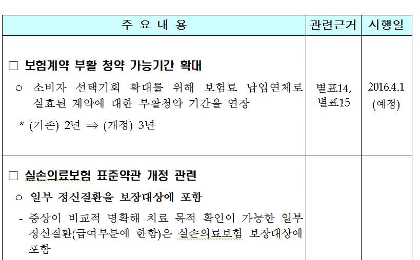 또 내년 4월부터는 보험계약 부활 청약 가능기간이 2년에서 3년으로 바뀐다. 보험료 납입연체로 실효된 계약에 대한 부활 청약 기간이 3년으로 연장된 데 따른 것이다.