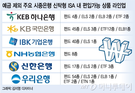 머니투데이가 주요 6개 시중은행(KEB하나·국민·기업·농협·신한·우리)의 신탁형 ISA 라인업을 분석한 결과 대체로 대형 은행들의 예금만 넣을 수 있었다. 일부 대형 은행의 예금을 편입하지 못하는 경우도 있었다. 예를 들어 이날 현재 신한은행과 우리은행 ISA엔 KEB하나은행의 예금을 넣을 수 없었다. 시중은행보다 금리가 높은 저축은행 예금을 ISA에 편입할 수 있는 은행도 현재로선 우리은행뿐이다. 저축은행중앙회와 협약을 맺은 우리은행에선 SBI, OK, JT친애저축은행 등 대형 저축은행의 예금을 ISA에 편입할 수 있다.