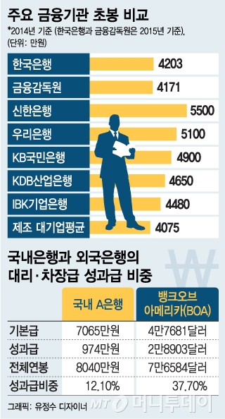 ◇美 상업은행 과장, 연봉이 9배차까지 벌어져..성과급이 40% 육박=시중은행의 '철밥통' 임금체계는 세계 주요은행과도 대비된다. 글로벌 은행은 호봉제가 없고 직무별로 차등해 기본급이 책정된다. 직급이 같더라도 어떤 일을 하느냐에 따라 총연봉이 1.5배에서 9배까지 차이가 난다.